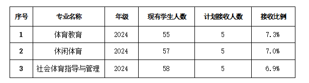 2.转入计划:根据海南热带海洋学院学生学籍管理实施细则要求,经体育与健康学院党政联席会研究决定,各专业接收人数见下表。